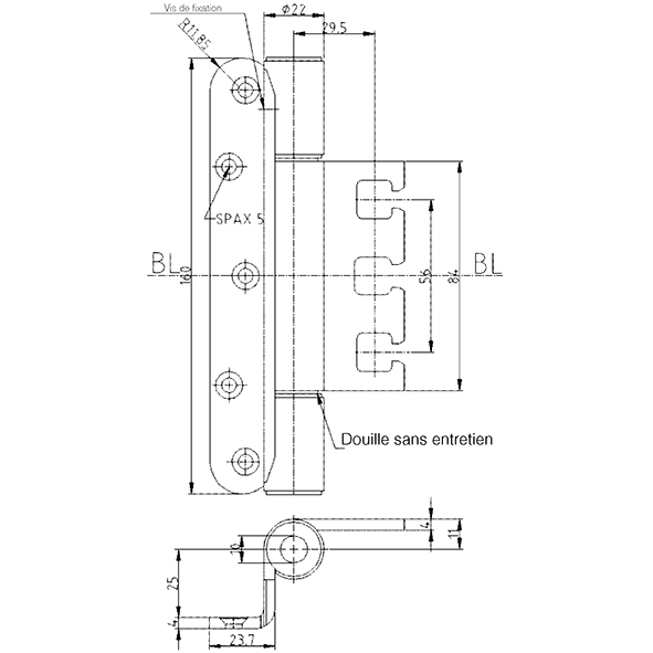 inox brossé, pour portes à recouvrement, sans entretien, avec goupille de sécurité, construit un démontage, épaisseur de platine 4 mm, pour l'utilisation sur des portes dans des voies d'évacuation et de secours avec des exigences en matière de protection contre la fumée et l'incendie, force portante avec 2 fiches env. 200 kg