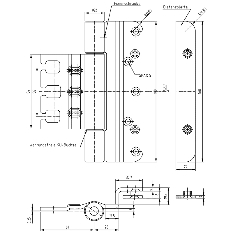 inox brossé, pour portes affleurantes à rainure, avec joint continu, sans entretien, avec goupille de sécurité, construit un démontage, épaisseur de platine 4 mm, force portante avec 2 fiches env. 160 kg