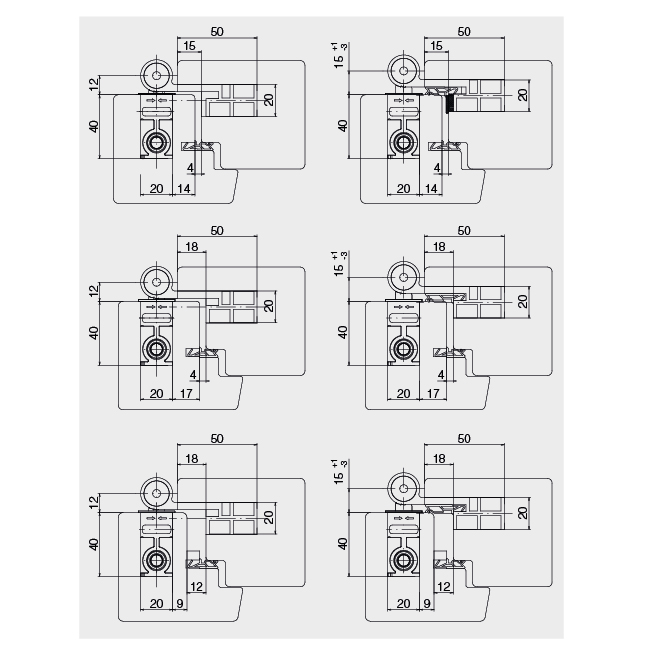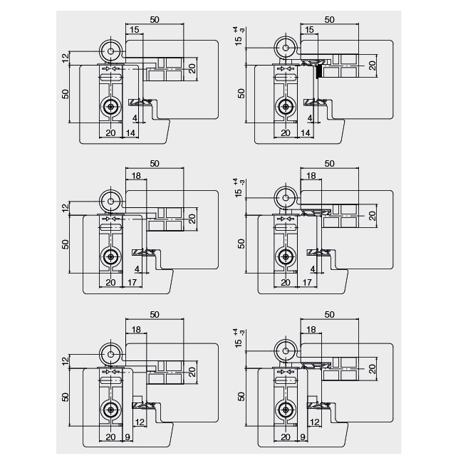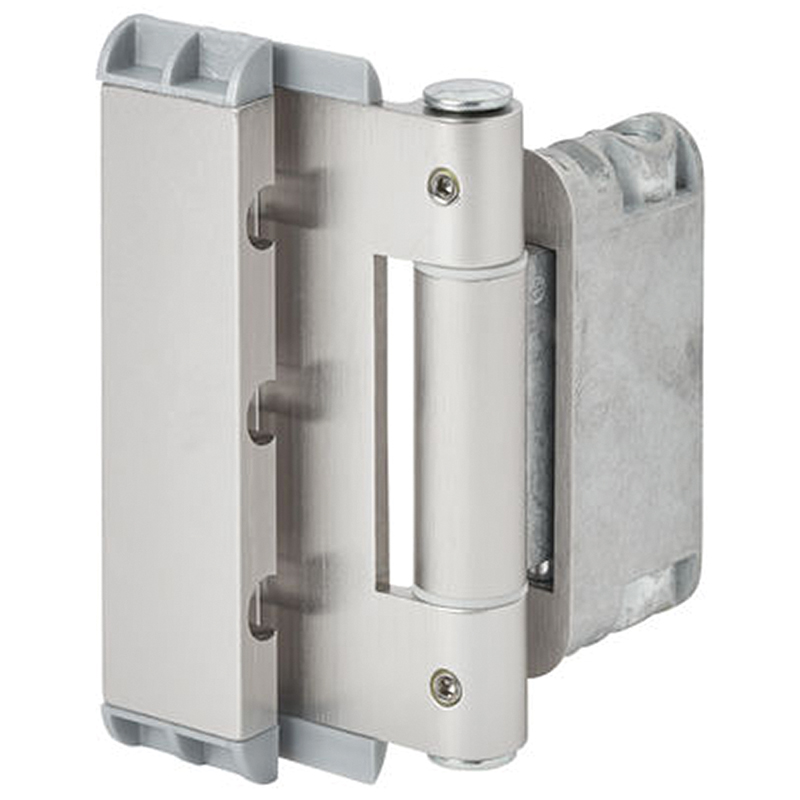 Aluminium, anodisé aspect inox brossé, avec ou sans joint de feuillure, jeu en feuillure 4 et 12 mm recouvrement 15 / 18 mm, pour portes en bois et portes-fenêtres à feuillure, avec sécurité à goupille, sans entretien, réglable en 3 dimensions (indépendamment les unes des autres), réglage possible même lorsque la porte est fermée, réglage latéral ± 3 mm, réglage en hauteur +3 / -2 mm,