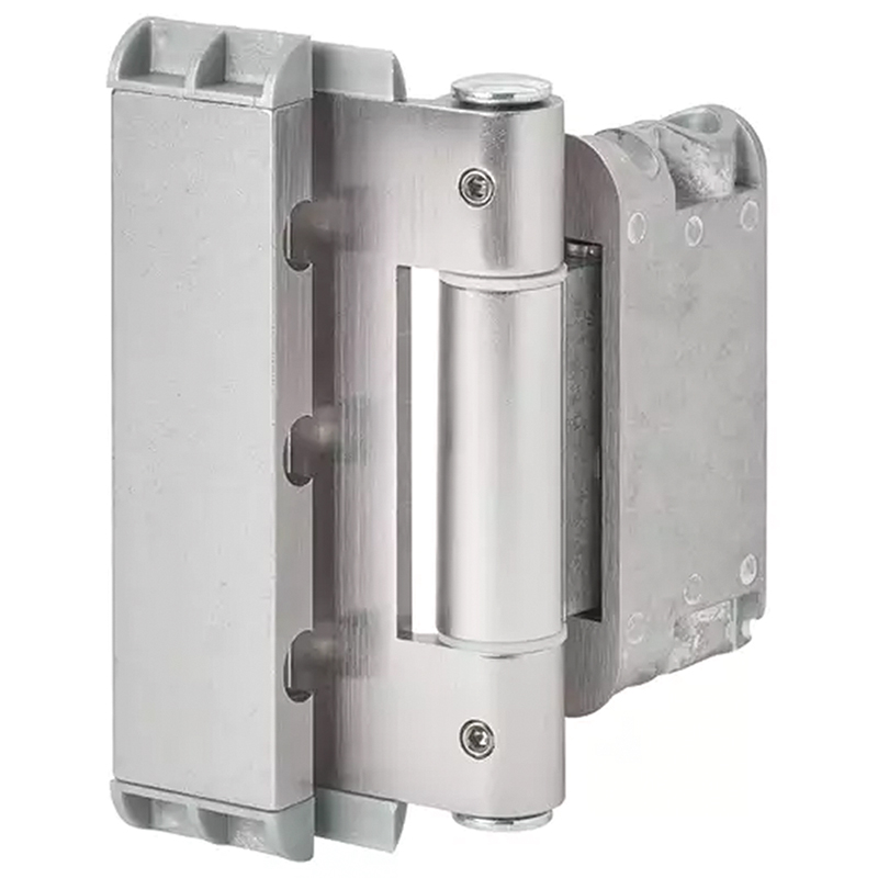 Aluminium, anodisé aspect inox brossé, avec ou sans joint de feuillure, jeu en feuillure 4 mm, recouvrement 12 / 14 mm, pour portes en bois et portes-fenêtres à feuillure, avec sécurité par goupille, sans entretien, réglable en 3 dimensions (indépendamment les unes des autres), réglage possible même lorsque la porte est fermée, réglage latéral ± 3 mm, réglage en hauteur + 3 mm / - 2 mm, réglage de la pression (voir tableau), poids de porte jusqu'à 160 kilos (avec 2 paumelles)
