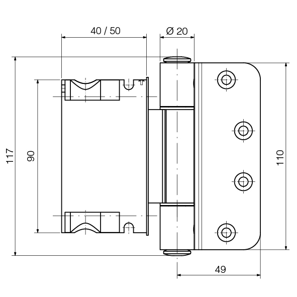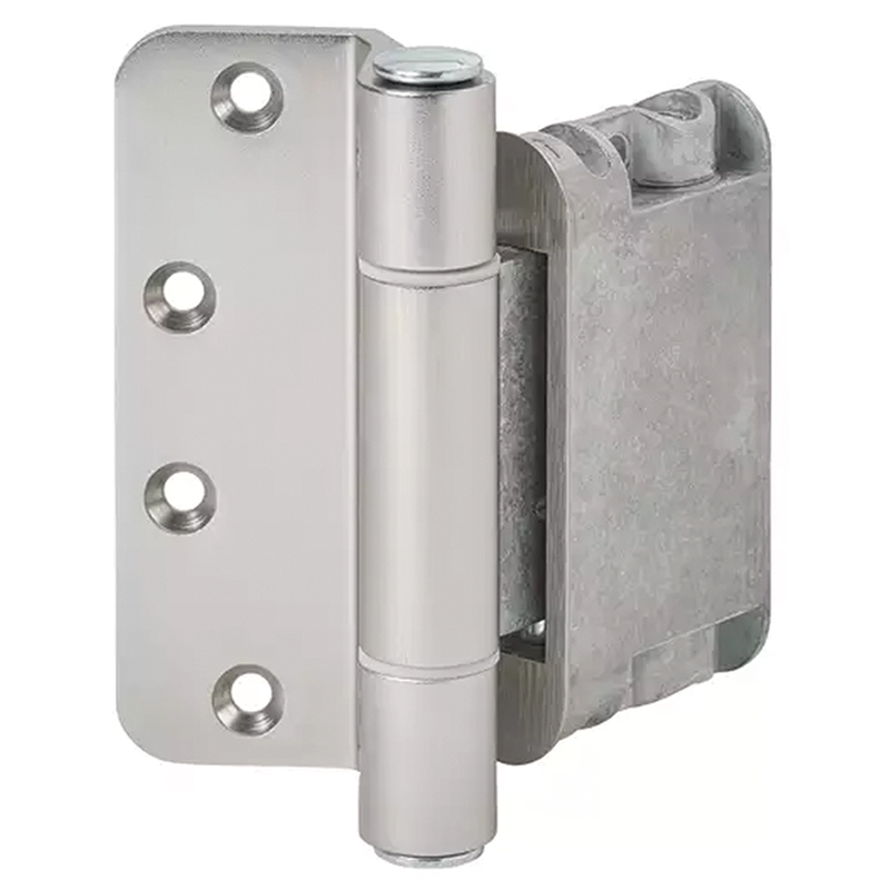 Aluminium, anodisé aspect inox brossé, avec sécurité à goupille, sans entretien, joint 12 mm, jeu en feuillure 4 mm, pour portes à fleur, réglable en 3 dimensions (indépendamment les unes des autres), réglage possible même lorsque la porte est fermée, réglage latéral ± 3 mm, réglage en hauteur + 3 mm / - 2 mm, réglage de la pression (voir tableau),