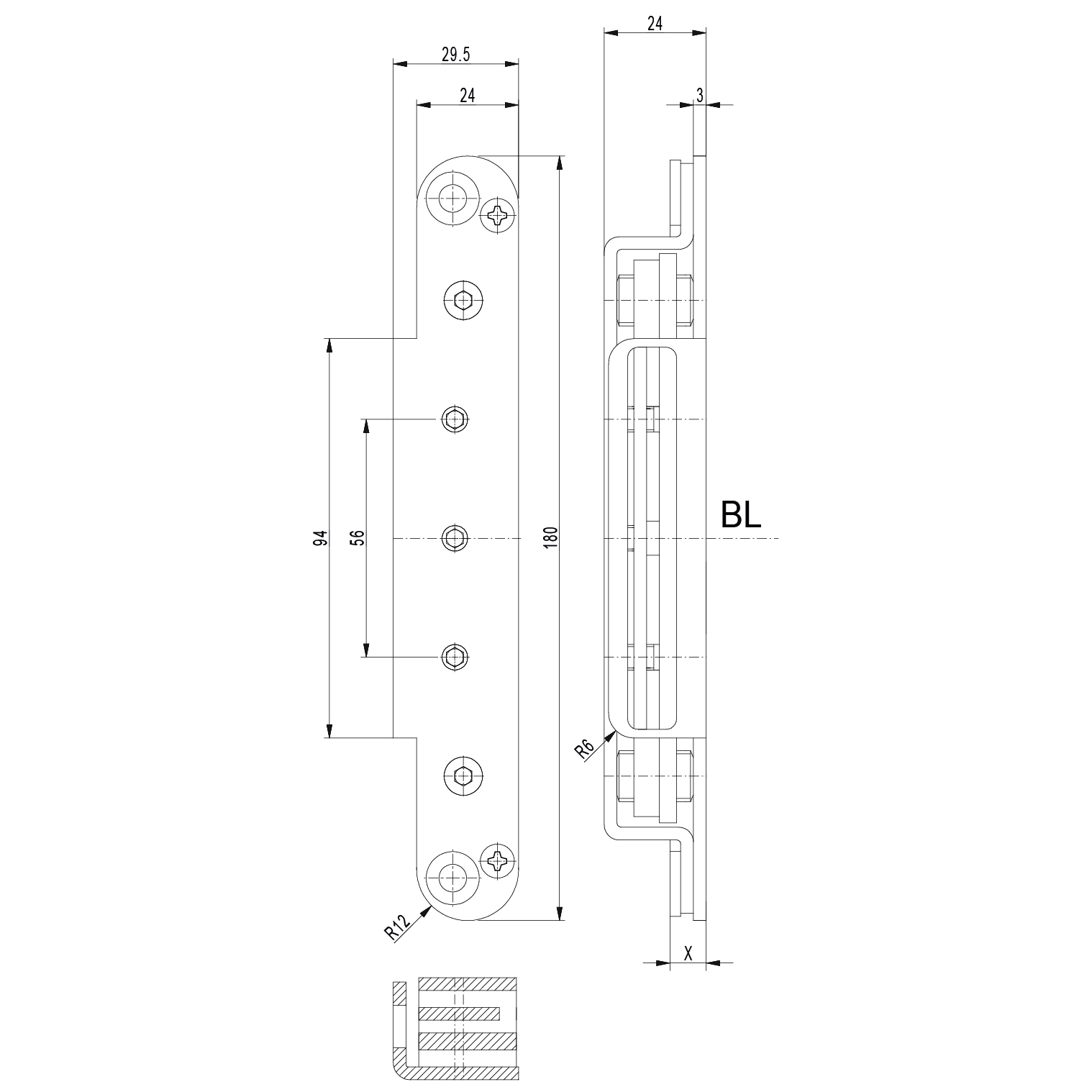 Châssis acier, angle de protection inox brossé, montage complet, découpe de protection intégrée, plage de réglage de 3 mm, plaque frontale massive, force portante avec 2 fiches env. 150 kg