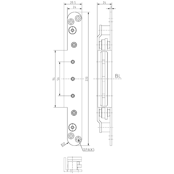 Châssis acier, angle de protection inox brossé, montage complet, découpe de protection intégré, plage de réglage de 3 mm, plaque frontale massive, force portante avec 2 fiches env. 150 kg