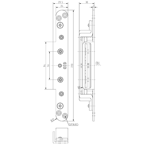 Châssis acier, angle de protection inox brossé, montage complet, découpe de protection intégré, plage de réglage de 3 mm, plaque frontale massive, réglage de la hauteur intégré à l'ajustement d'un-homme de l'élément de porte, force portante avec 2 fiches env. 100 kg