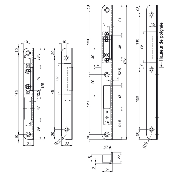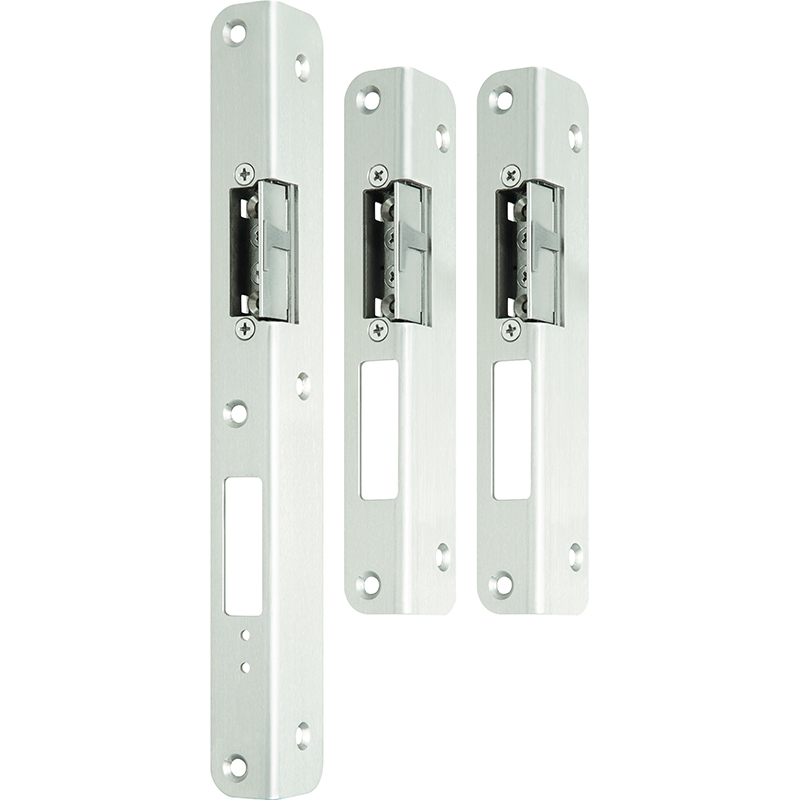 Inox mat, arrondi, avec pièce de rechange, réglable de 0 à 3 mm, avec découpe pour verrou et bec-de-cane, gâche centrale préparé pour le contact de commutation de boulon 1886, set à 3 pièces, consistant en 1 gâche centrale et 2 gâches supplémentaires, sans vis