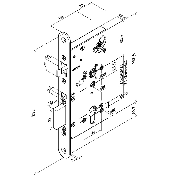 - Pêne DIN droit préréglé / commutable sur gauche.