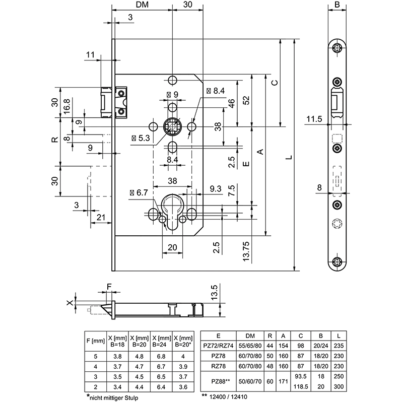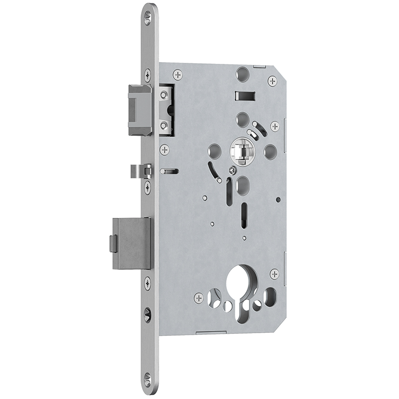 Inox mat, auto-verrouillage, commande de déroulement intégrée, fermeture silencieuse de la porte grâce au pêne confort ainsi qu'à l'expulsion amortie du pêne, logement de la poignée sans jeu grâce à la noix de serrage continue divisée, couple d'actionnement de la poignée et couple de maintien élevé linéaires grâce au nouveau design du ressort, testé selon EN 179, EN 1125, EN 1634, EN 12209