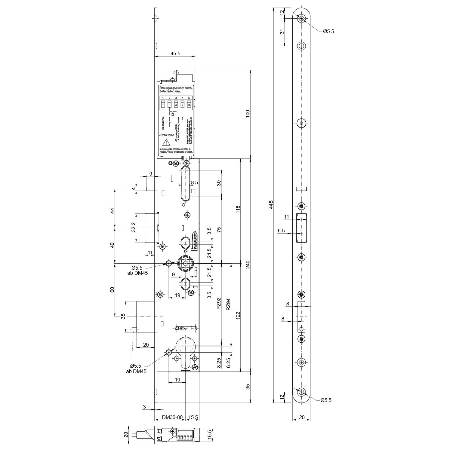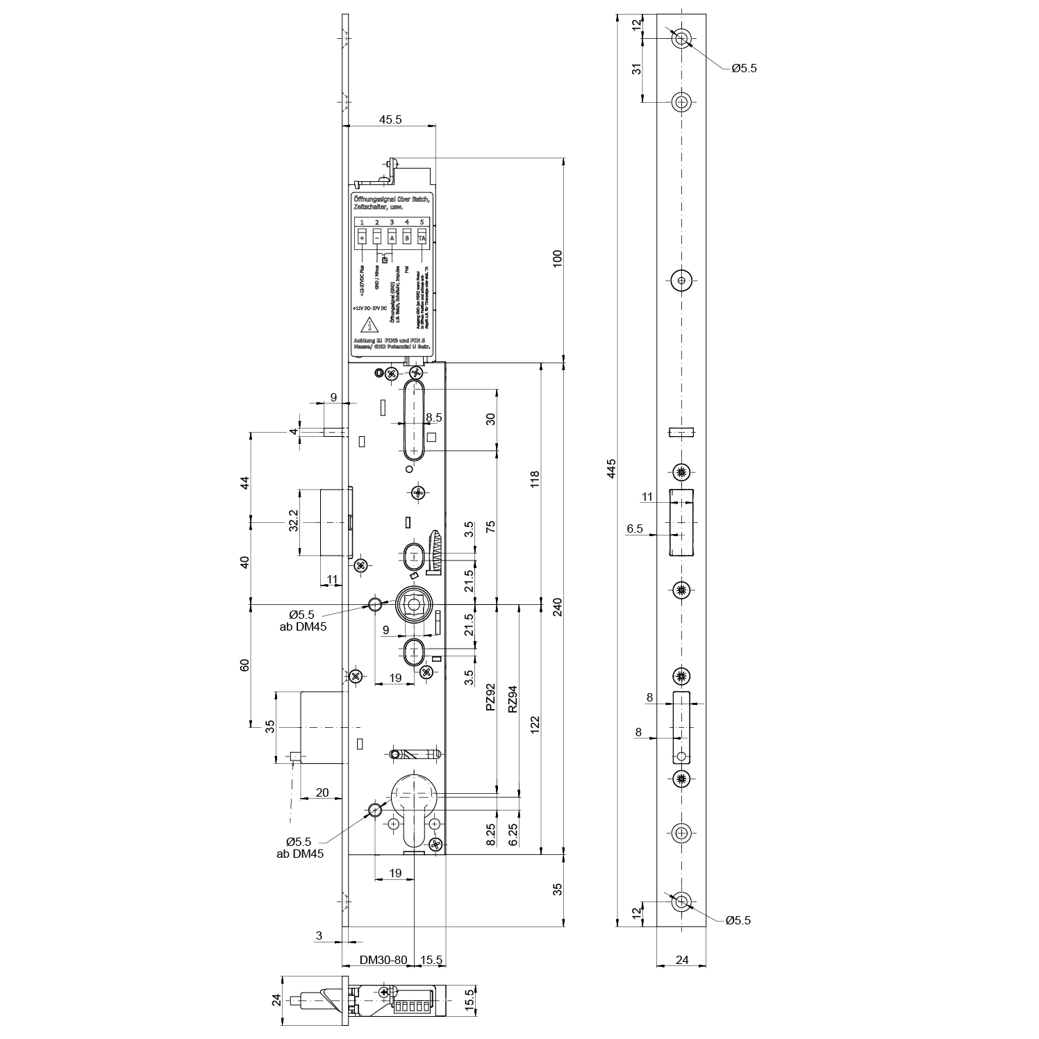 - Interface électrique RS 485, par ex. pour communication directe via lecteur biométrique et mémoire d'erreurs. Protection anti-manipulation impulsion d'ouverture uniquement via BUS.