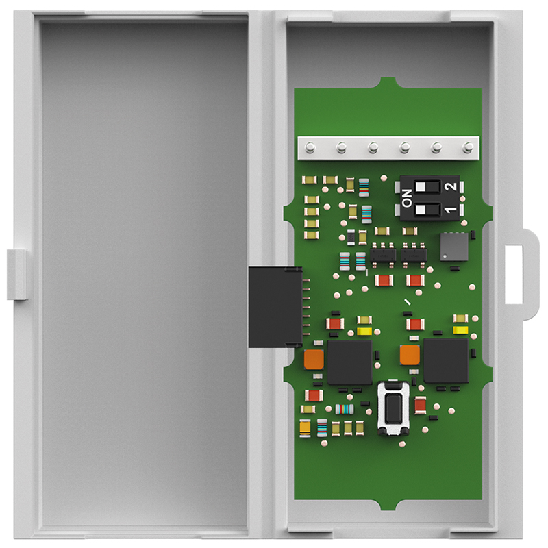 pour le raccordement de verrouillages de portes dormakaba analogiques TV 100, TV 200, TV 500 et TV 550 sans interface de bus DCW® à SafeRoute ou pour l'intégration de produits d'autres marques avec contacts de commutation analogiques (les certifications selon EltVTR ou EN 13637 doivent être respectées), en raison de sa petite taille, convient en particulier au montage dans des cadres profilés, longueur maximale de câble entre l'adaptateur et l'élément de verrouillage analogique 5 m