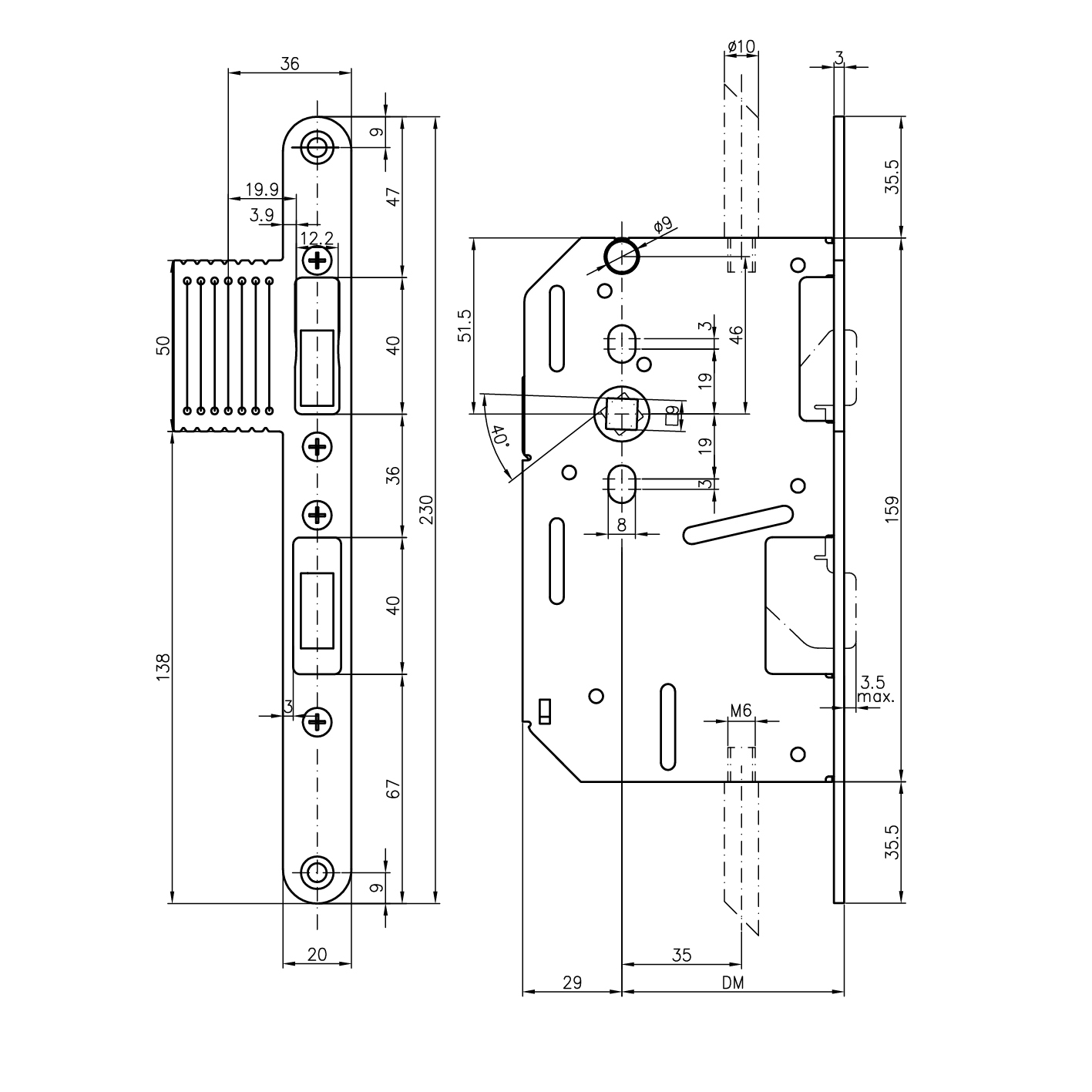 pour barre ronde Ø 10 mm, filetage M6 pour verrouillage en haut et en bas, position de la barre dimension du mandrin -35 mm, fouillot traversant 9 mm, rotation de la béquille 40°, sans serrure de commande, sans accessoires
