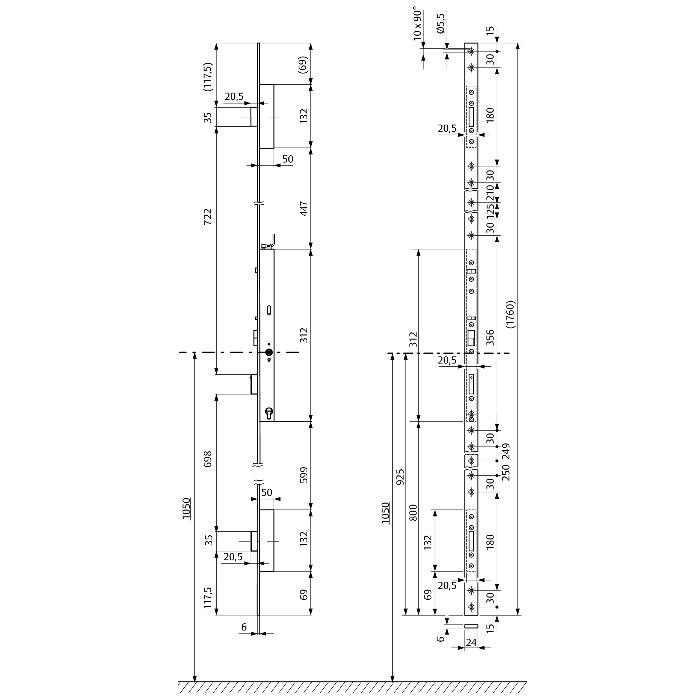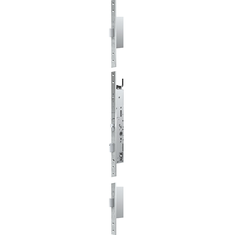 Serrure multipoints de securité effeff 519NE, avec têtière d'angle 24 x 1760 mm inox mat, motorisé, avec fonction anti-panique