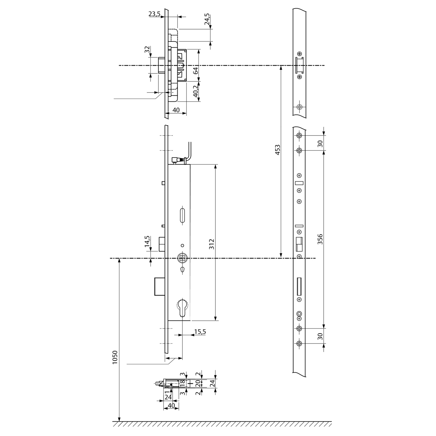 Serrure multipoints de securité effeff 819NE, avec têtière d'angle 24 x 1760 mm inox mat, à commande de béquille avec serrure à pêne demi-tour, avec fonction anti-panique