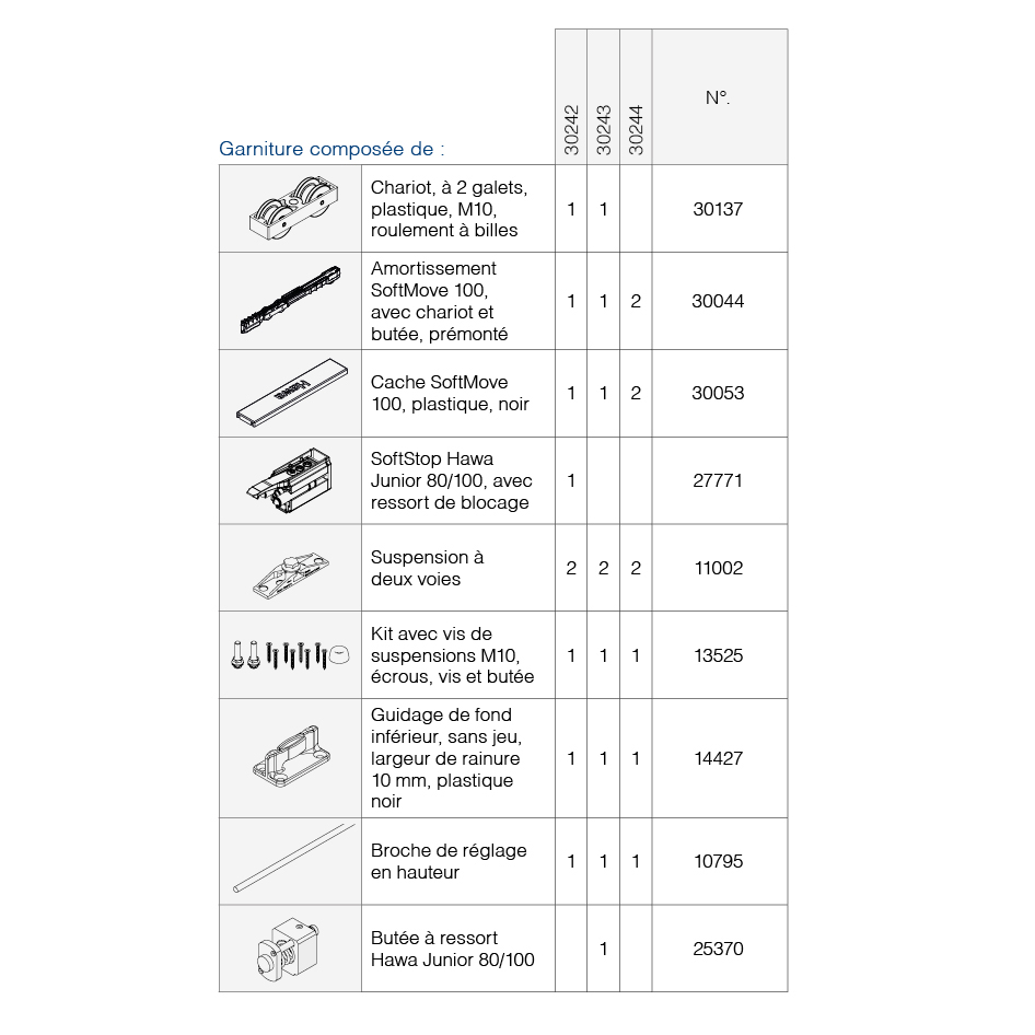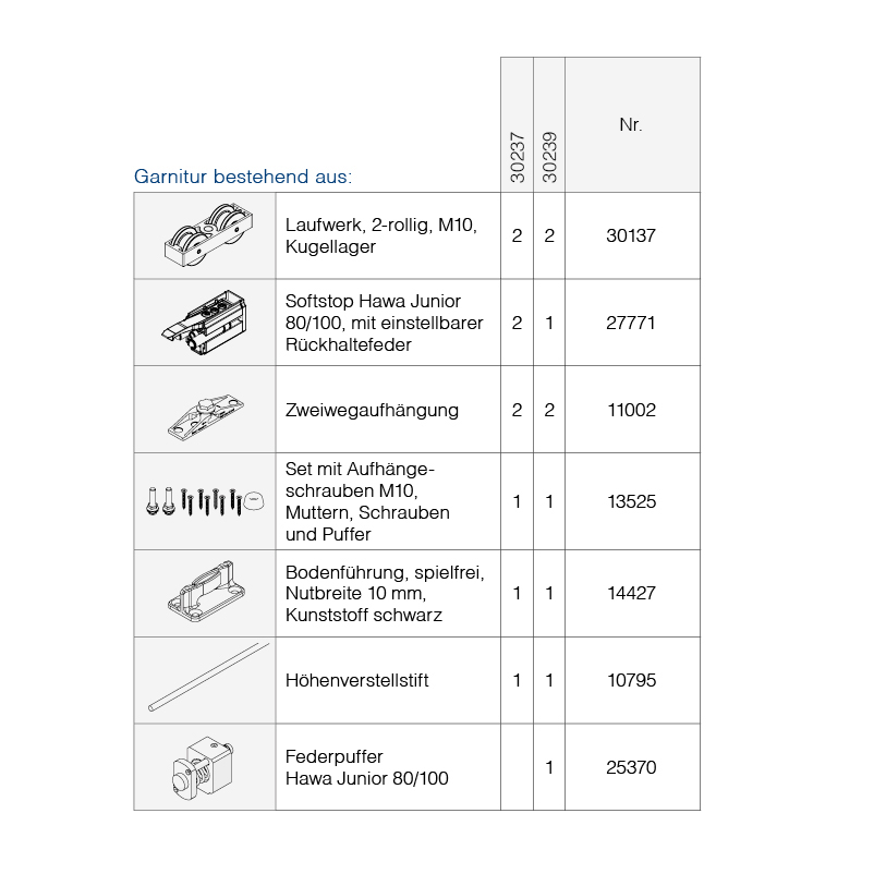 Ferrure de porte coulissante bois, garniture complète HAWA Junior 100 Z / Z Pocket