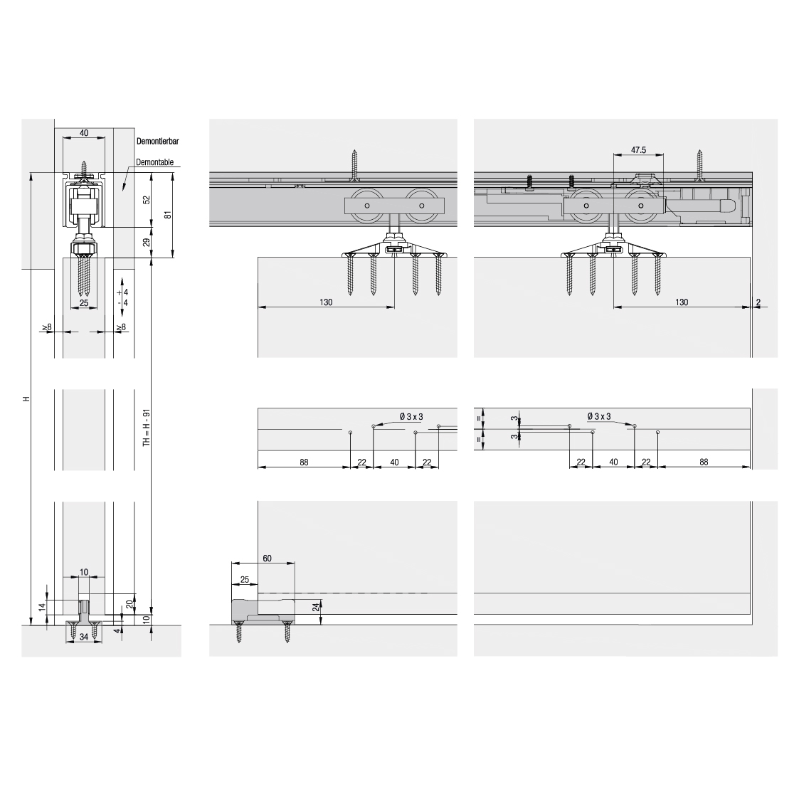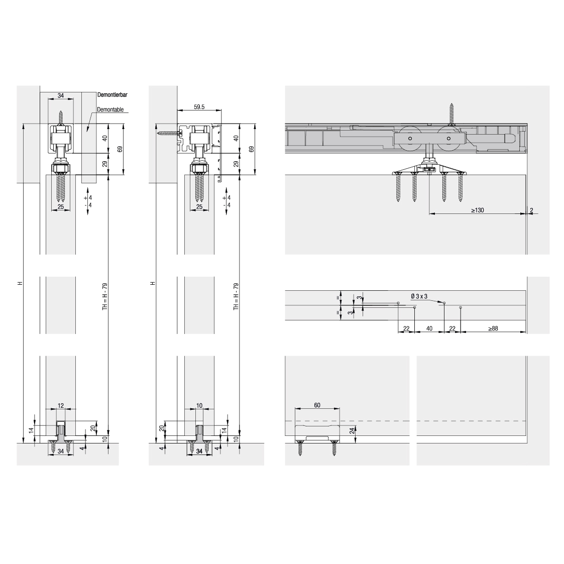 Ferrure pour portes en bois jusqu'à 100 kg se déplaçant en partie supérieure, avec rail de roulement en applique, ouverture sans obstacle, au choix avec Softstop, amortisseur SoftMove et/ou butée à ressort, sans rail de roulement