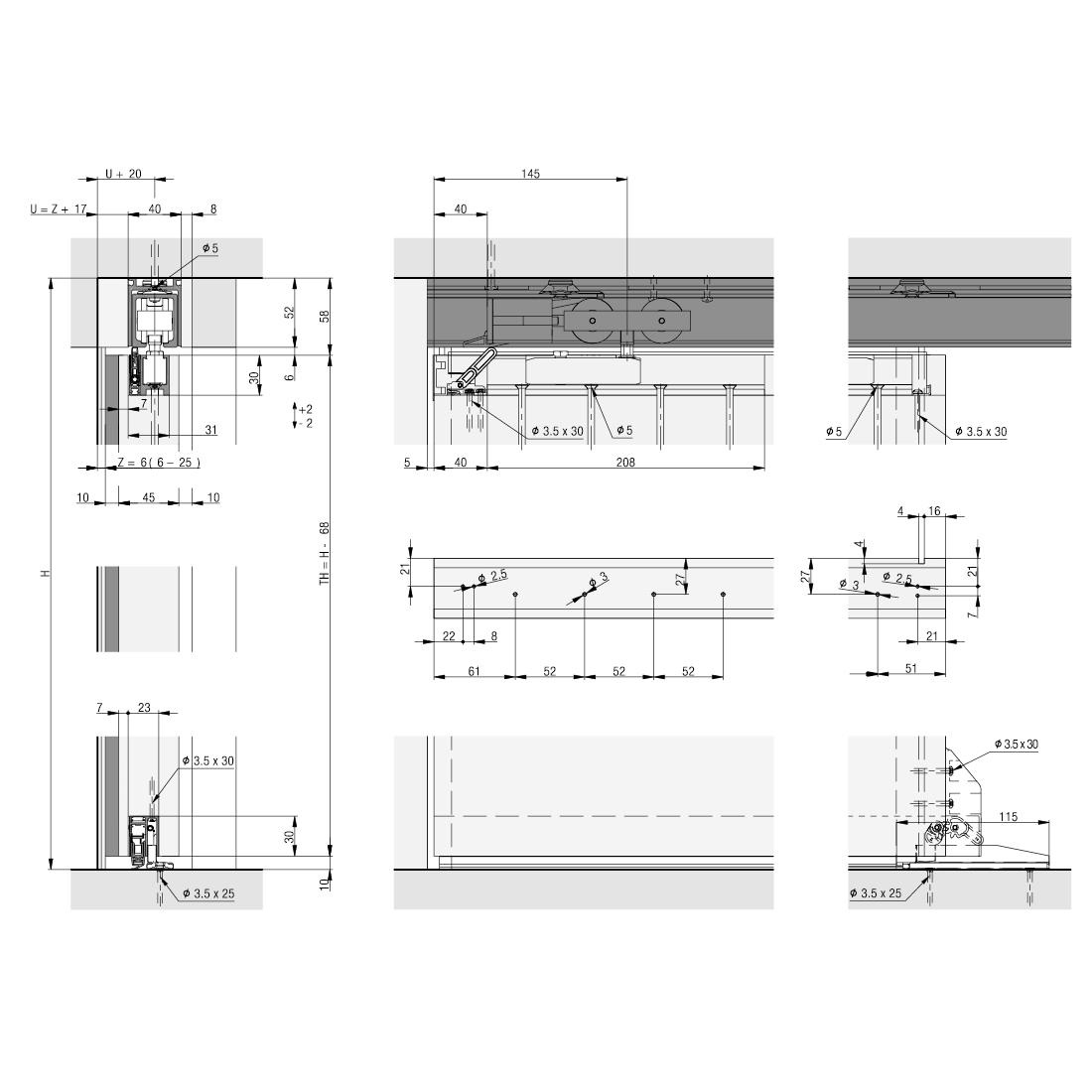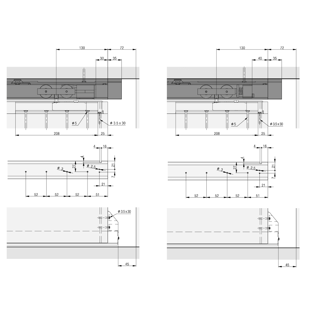 Ferrure pour portes en bois se déplaçant en partie supérieure, avec rail de roulement en applique ou à fleur de plafond, montage au plafond, solution de poche murale, hauteur de montage minimale, confort d'habitation élevé grâce à une isolation efficace contre le bruit, les courants d'air, les odeurs et l'incidence de lumière indésirable, jusqu'à 41 dB maxi (la valeur d'isolation dépend de l'ensemble de la construction), sans rail de roulement, sans garniture d'étanchéité