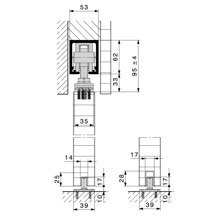 étriers de suspension robustes, réglables en hauteur et latéralement, mécanisme de roulement avec technique de palier lisse et galets en plastique pour un fonctionnement très silencieux