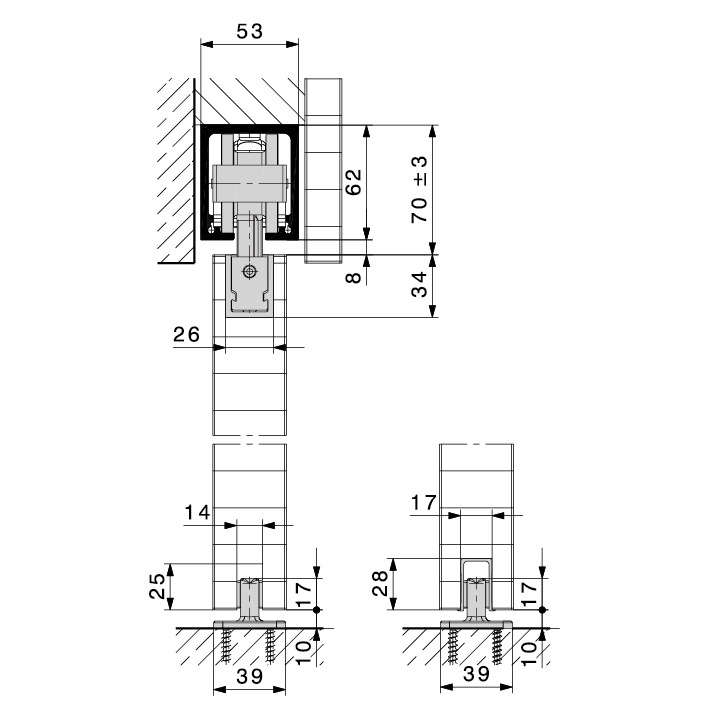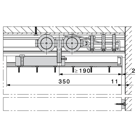 - Pour une répartition optimale du poids de la porte, nous recommandons le montage supplémentaire d'un profil porteur traversant 21.112.46/96 pour les portes coulissantes lourdes.