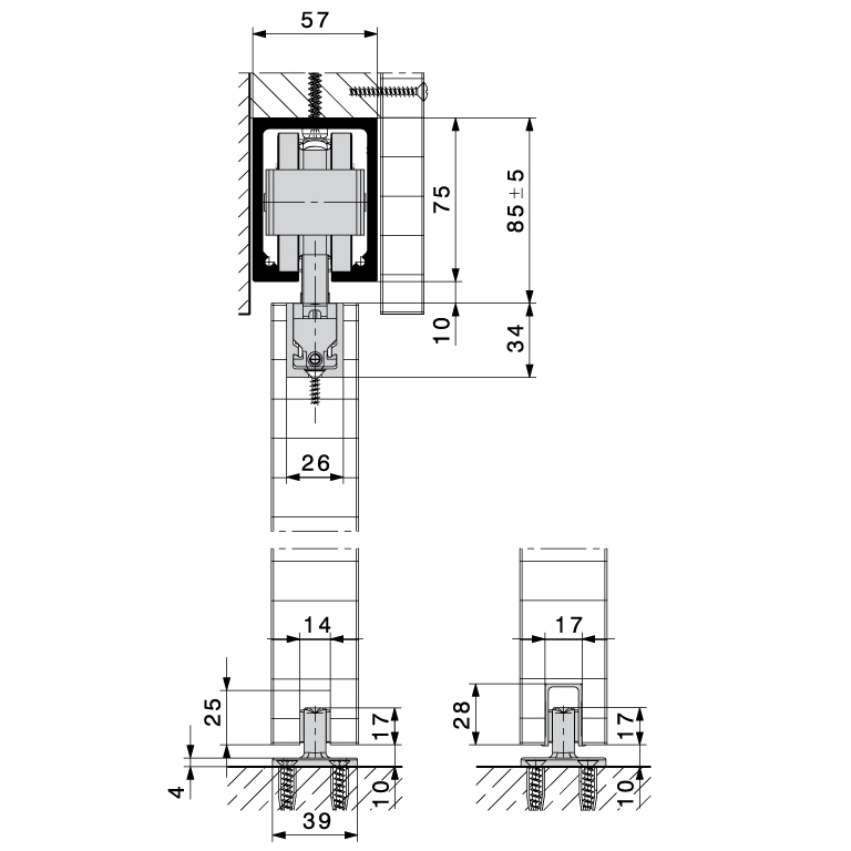 avec suspension de profilé porteur à fraiser pour une hauteur de montage minimale, réglable en hauteur, chariots avec technique de palier lisse et galets en plastique pour un fonctionnement très silencieux