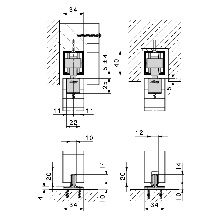 Montage en applique pour portes coulissantes en bois jusqu'à 80 kilos de poids de porte, avec suspension de profilé porteur à fraiser 22 x 25 mm, pour une hauteur de montage minimale, réglable en hauteur ± 7 mm, (réglage grossier ± 3 mm, réglage fin ± 4 mm), mécanismes de roulement avec technique de palier lisse et galets en plastique pour un fonctionnement très silencieux