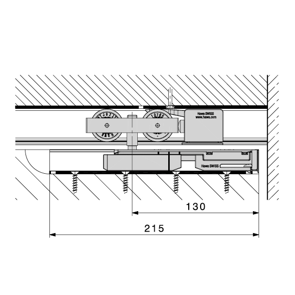 - Egalement disponible en usine: Grâce à la garniture HAWA no 24851 avec vis de suspension plus longue, le rail de roulement peut être caché par le dessous avec des éléments de plafond démontables.
