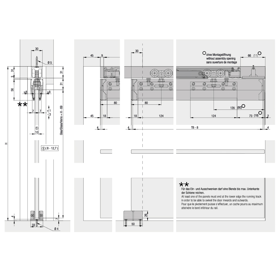 - Épaisseur de porte verre ESG 8, 10, 12 et 12,7 mm, verre VSG 8,7 - 12,7 mm.