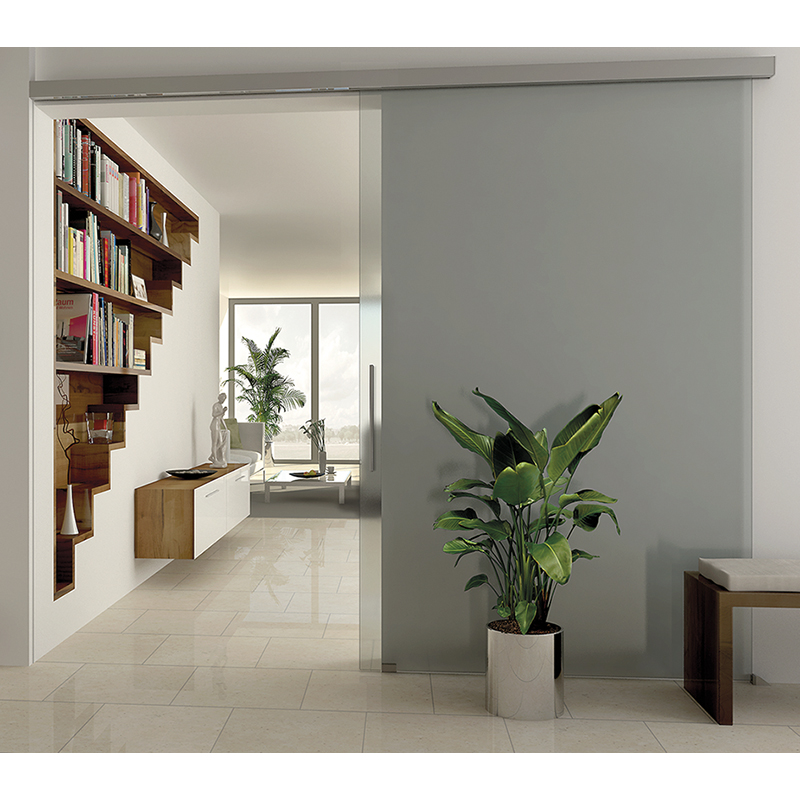 avec suspension à cale pour un montage rationnel et facile ferrures de design raffiné pour portes coulissantes en verre ESG / VSG, avec suspension invisible intégrée dans la glissière, pour montage au mur, au plafond et intégré dans le plafond, mécanismes de roulement avec technologie de roulement à billes pour une grande régularité de fonctionnement, largeur minimale des portes à partir de 600 mm (sans amortissement) avec éléments de fixation du verre et guidage au sol, sans glissières, sans accessoires