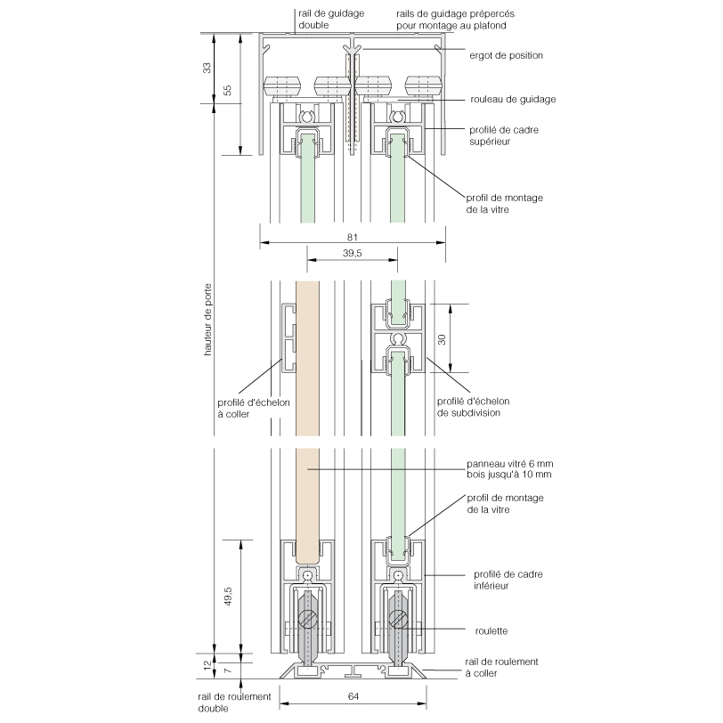 Profils de montage du verre souples et gabarit de perçage, kit avec ou sans rails de roulement et de guidage à 2 voies