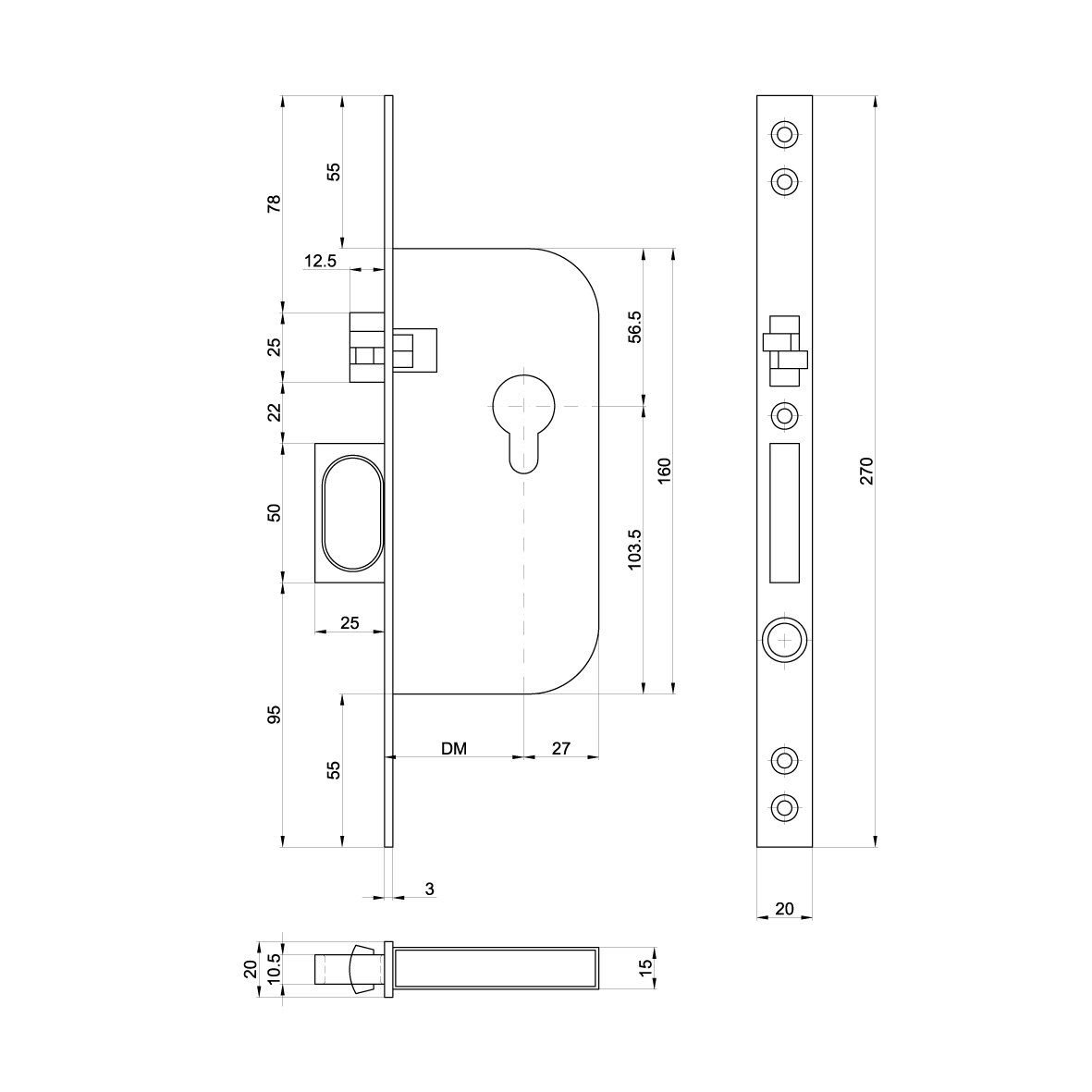 Serrure à mortaiser pr porte coulissante MSL 1603, avec têtière ronde 20 x 270 mm