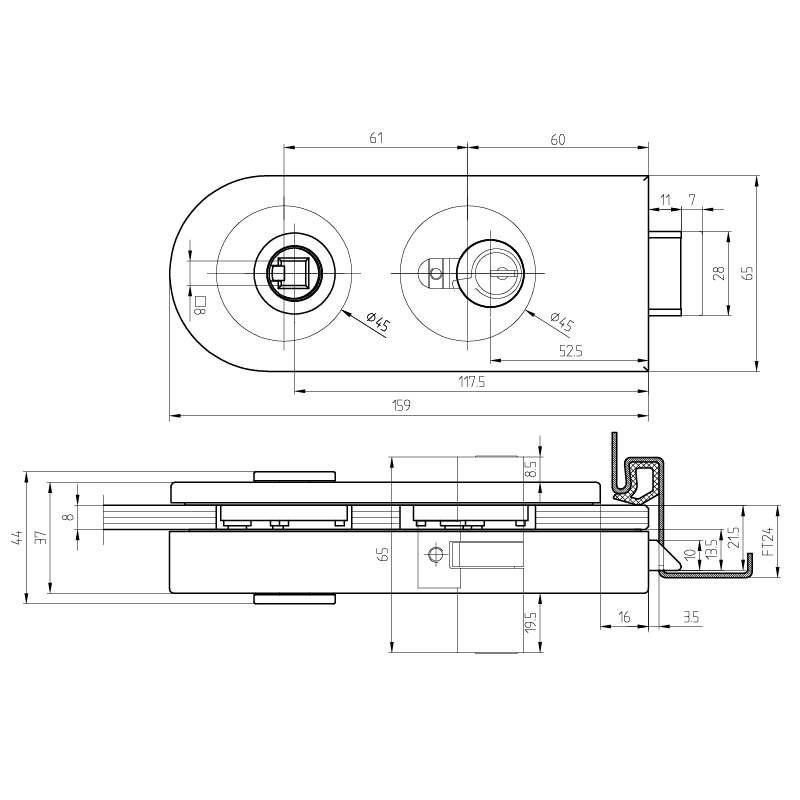 | arrière | sans | noir RAL 9005 | Aluminium | 159 | 65 | 8 - 10 | 8 | 1 vantail, 2 vantaux | DIN universel | Studio | Serrure de porte en verre | 10.200 | |