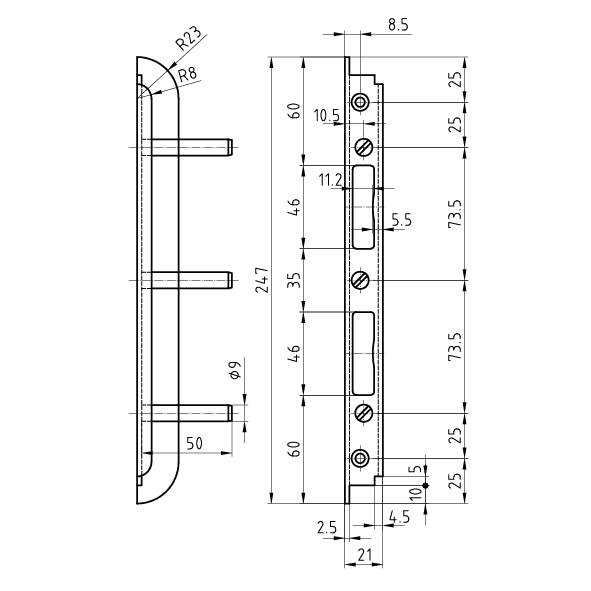 Boulon d'appui Ø 9 x 50 mm, avec découpe pour le pêne dormant et le pêne demi-tour, utilisable universellement DIN droite et DIN gauche, sans vis