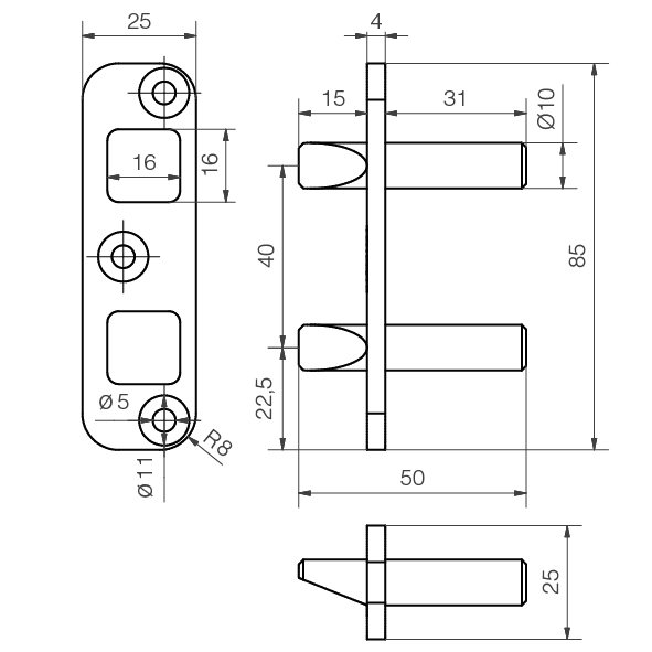 Acier galvanisé ou acier inoxydable, à encastrer dans la porte et le cadre du côté des paumelles, pour portes extérieures anti-effraction selon SN EN 1627, testé jusqu'à RC3, kit comprenant une partie perforée, une partie à goupille, des vis de fixation et des entretoises contre le soulèvement horizontal