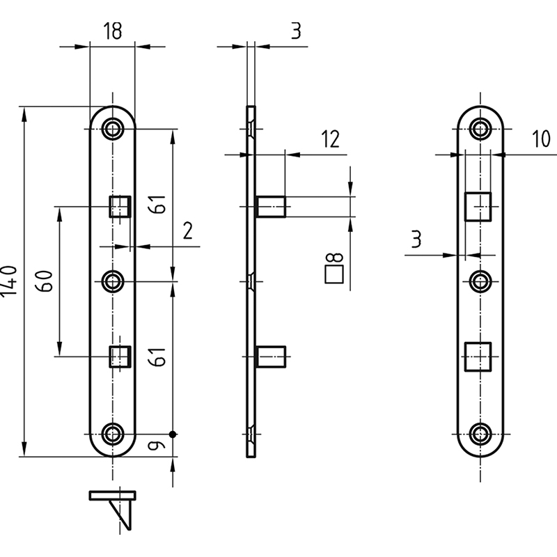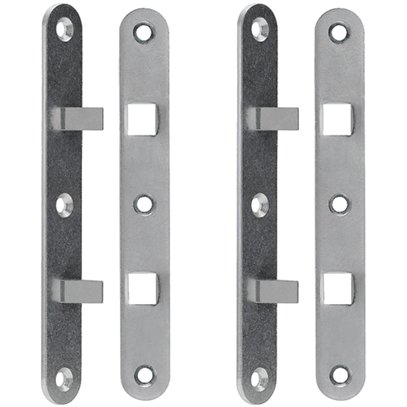 Acier galvanisé, à encastrer dans la porte et le cadre côté paumelles, protection invisible contre les tentatives de relevage, 1 garniture composée de 2 plaques avec gâche et contreplaques avec trous carrés