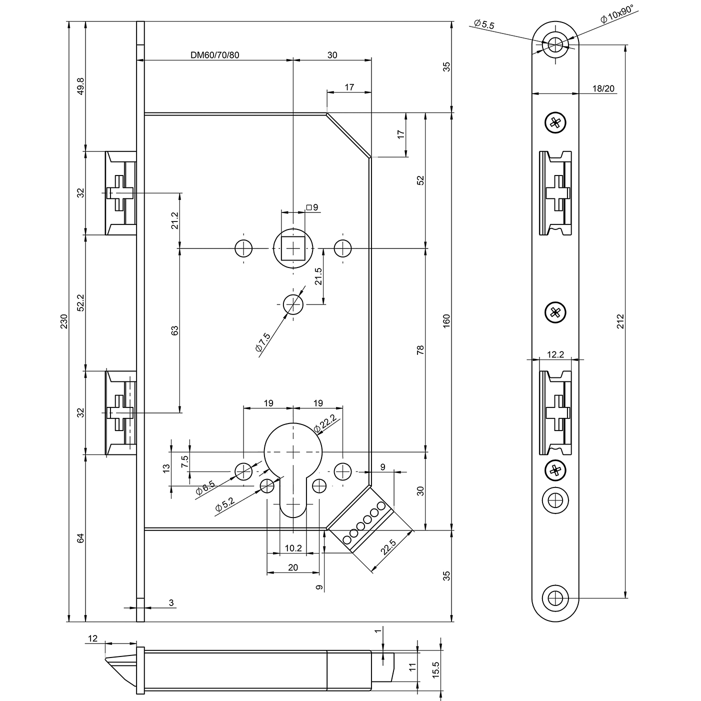 avec becs-de-cane Delrin, avec fouillot autoserrant, avec fonction de levier, le loquet tire le bec-de-cane supérieur en arrière, la clé (fonction de levier) tire les deux becs-de-cane en arrière, sans gâche