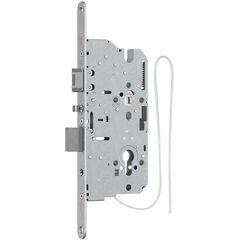 serrure à mortaiser à autoverrouillage avec couplage électrique séparé des deux côtés, blocage du bec-de-cane intégré, commande d'exécution mécanique, pour une utilisation avec poignée commandés et des exigences d'accès différentes dans des constructions de logements et des bâtiments industriels, les poignées gauche et droite peuvent être couplées / découplées séparé électriquement et optionnellement de façon durable, l'accès devient réglé par un système d'identification comme par ex. RFID, biométrique, un système de gestion technique du bâtiment etc. ou par le cylindre, les deux poignées peuvent être découplées / couplées simultanément temporaire par le cylindre tenu (ouverture d'urgence), le mode de fonctionnement (courant de repos/travail) est convertible gauche et droite séparément, bec-de-cane amorti, réversible DIN gauche et droite avec blocage, testée selon EN 12209, 14846, EN 1634, sans câble de raccordement, sans le set protection contre les manipulations