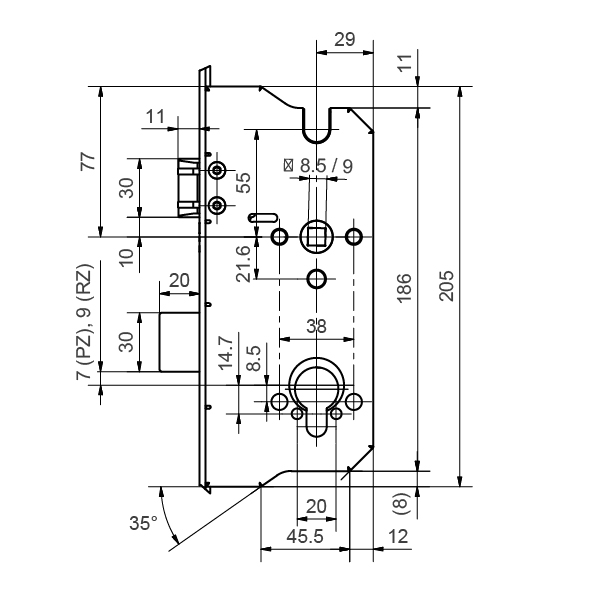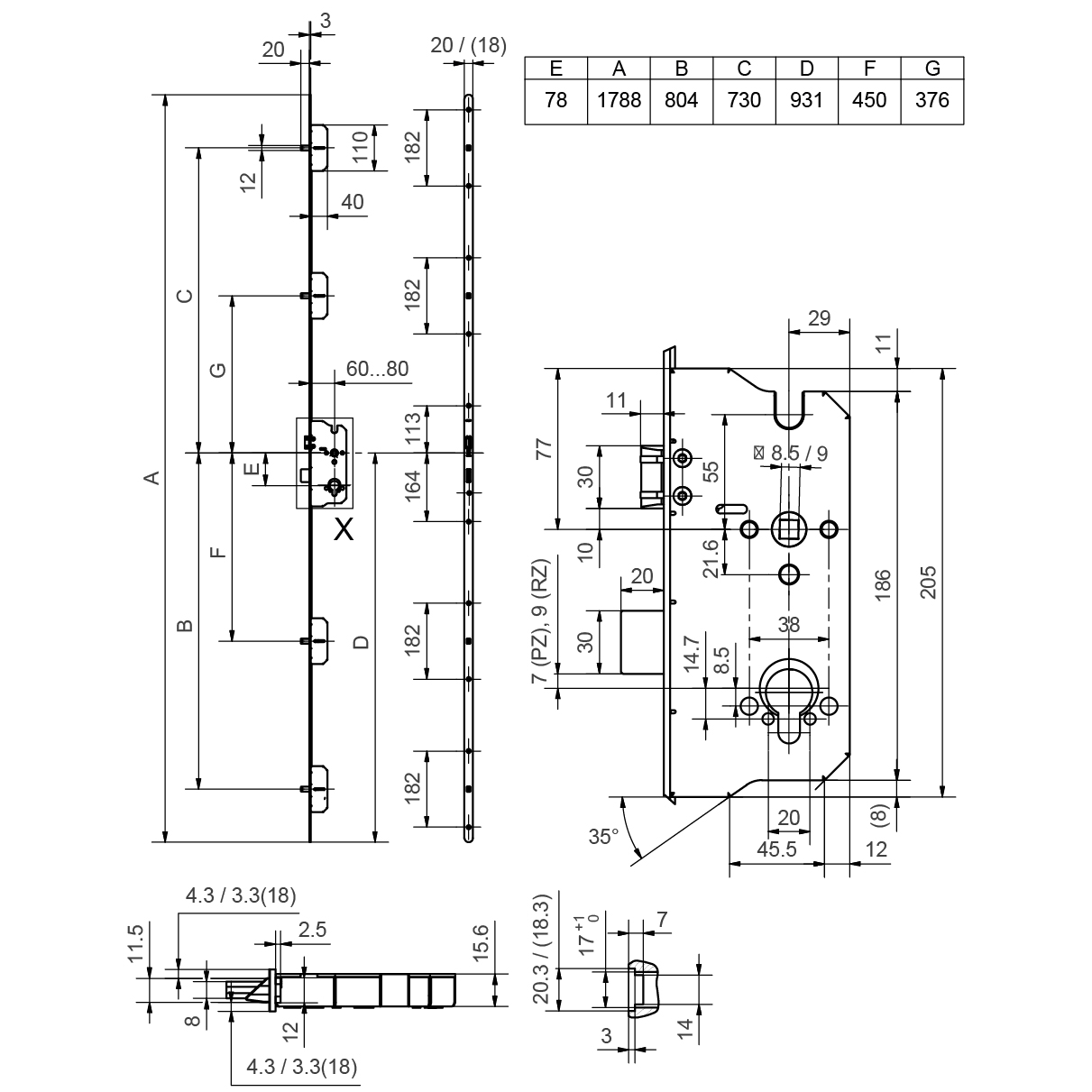 verrouillage 6 points par pêne dormant principal, 4 pênes dormants supplémentaires en acier trempé, 1 tour, sortie de pêne 20 mm, avec blocage de pêne et déblocage de béquille, avec pêne demi-tour en acier, réversible universellement DIN droite et DIN gauche, pêne dormant principal trempé 8 x 30 mm, 1 tour, sortie de pêne 20 mm, avec noix forcée, sans changement