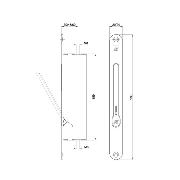 verrouillage automatique du vantail dormant pour portes à 2 vantaux, en liaison avec une serrure de retient, pour tiges rondes Ø 10 mm, filetage M6 pour verrouillage supérieur et inférieur, position de la tige = distance au canon, hauteur de boîte 159 mm, sans serrure de retient, sans accessoires
